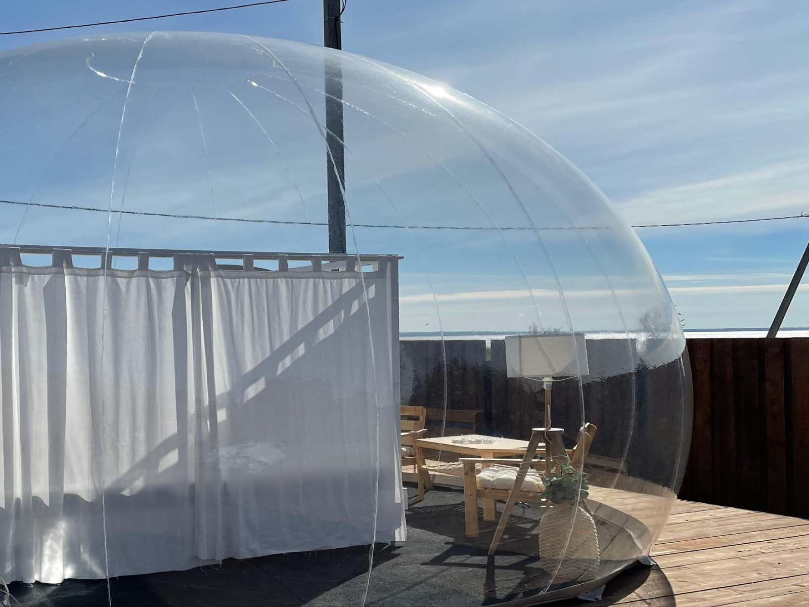 Для проживания на территории лагеря оборудованы 2 треугольных домика A-Frame и прозрачный баббл-шатер для двоих, из которого можно любоваться на звезды. Внутри он оборудован кондиционером, помимо кровати есть туалет, раковина с теплой водой, холодильник, микроволновка, чайник, посуда и проектор. Душа в номере нет. У домика есть купель фурако с подсветкой, мангал, кресла и стол. В стоимость проживания включено пользование баней и фурако. Проживание с детьми в данном домике невозможно.