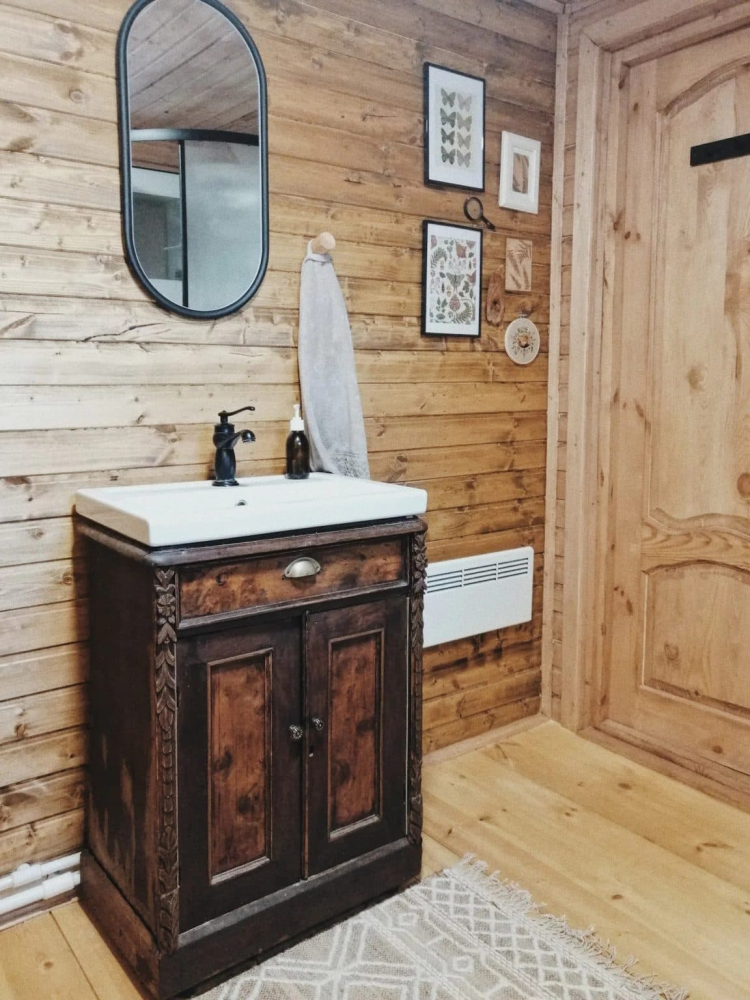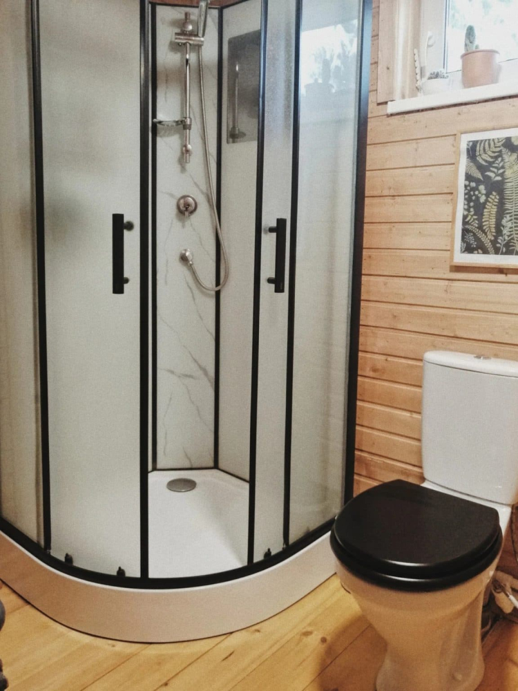 Внутри дома расположен туалет с душевой, где есть все необходимые банные принадлежности (полотенца, шампунь и кондиционер, гель для душа, мыло и крем для рук, мицеллярная вода для умывания и крем для лица и даже женский бокс), чтобы вам ни о чем не беспокоиться и приезжать к нам налегке