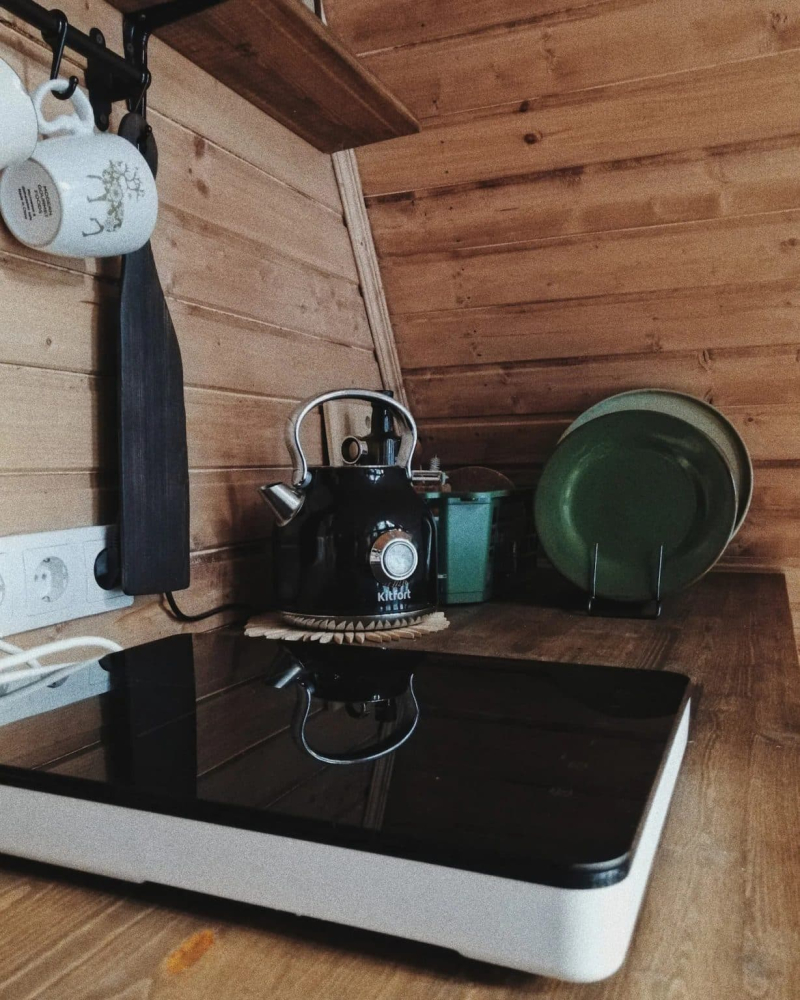 Для приготовления еды доступны индукционная плита в кухонной зоне и мангал на улице. В доме есть все самое необходимое для готовки и сервировки: набор посуды, столовые приборы, кофеварка, кухонный текстиль и даже растительное масло, крупы, соль, специи, чай и кофе. В вашем распоряжении мини холодильник с морозильной камерой для хранения привезенных продуктов.