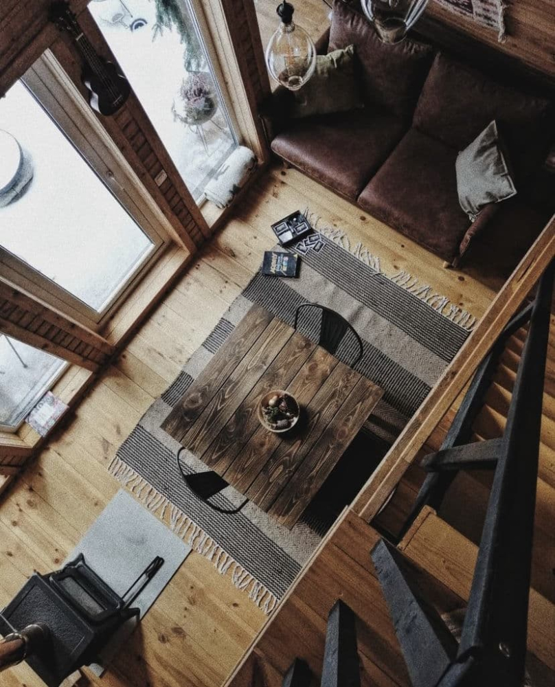 Внизу общая зона, соединяющая кухню-столовую и гостиную. Здесь же на удобном двуспальном диване могут ночевать дополнительные гости, если вы захотите приехать втроем или вчетвером. Все постельные принадлежности, дополнительные пледы/одеяла входят в стоимость бронирования.