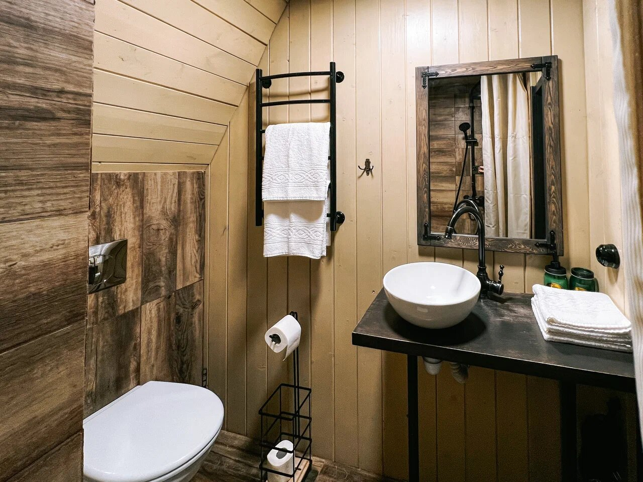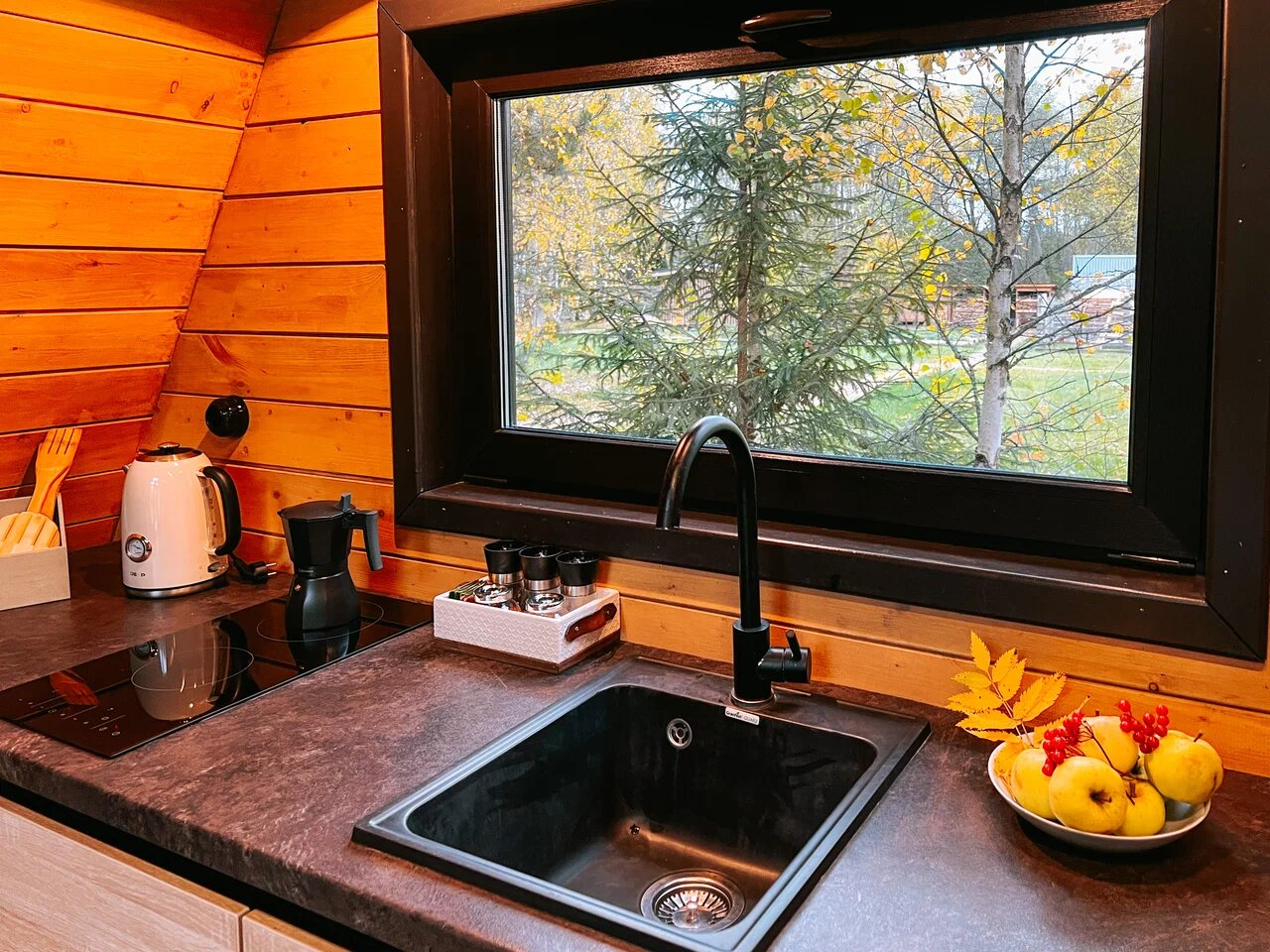 У каждого домика своя уютная терраса, зона BBQ с гриль-очагом (кострищем) и мангалом. В домике с комфортом могут разместиться до 4х человек, здесь есть всё необходимое.