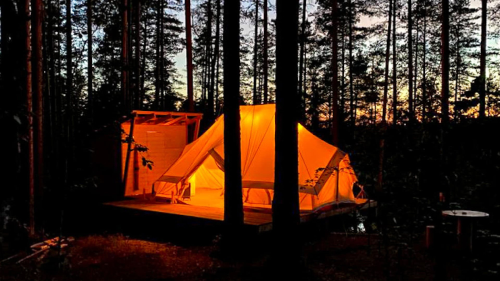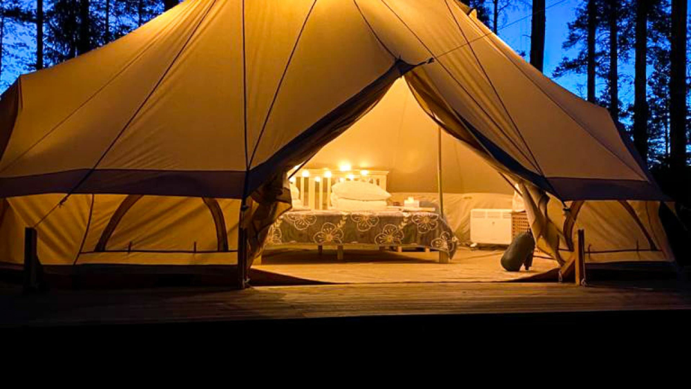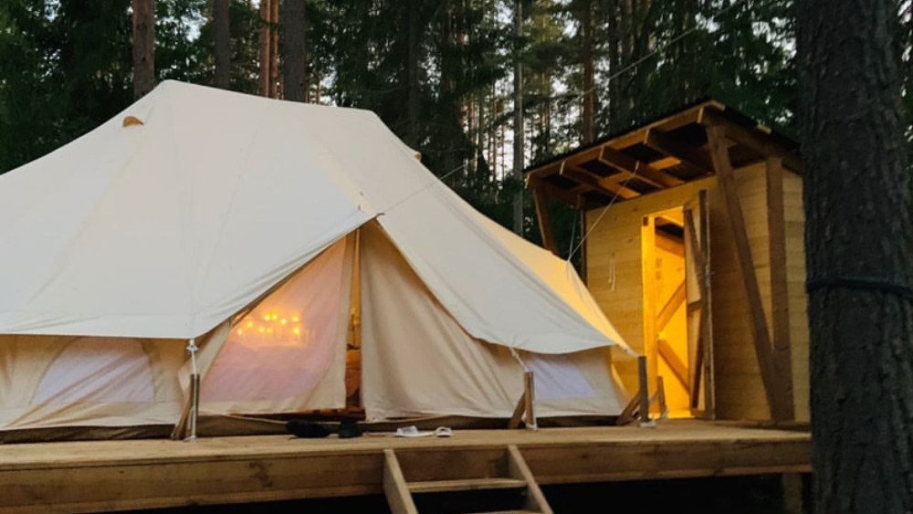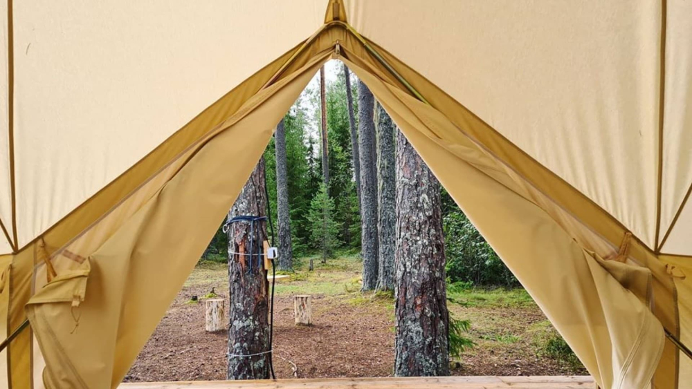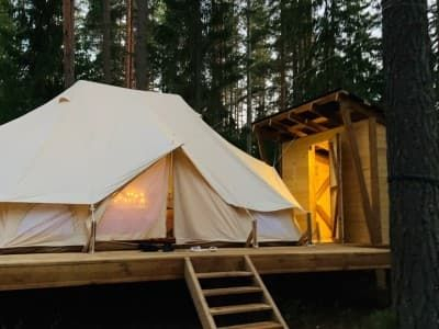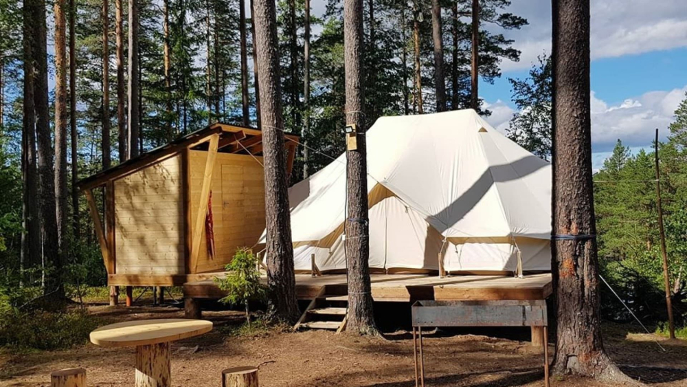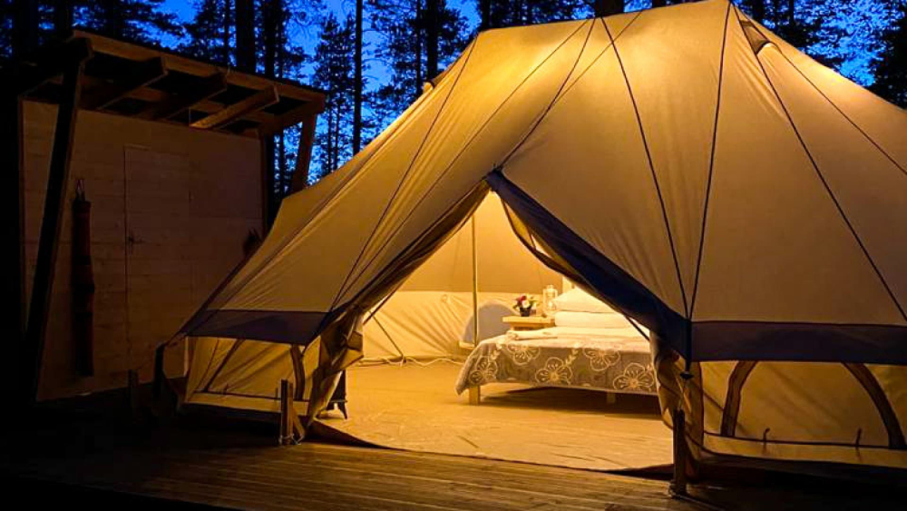 На территории базы расположилось 5 уютных шатров: три шатра с прекрасным видом на озеро Лампушка и два шатра посреди соснового леса. Живописный ландшафт, первозданная природа вокруг порадует вас и окутает невероятной атмосферой.