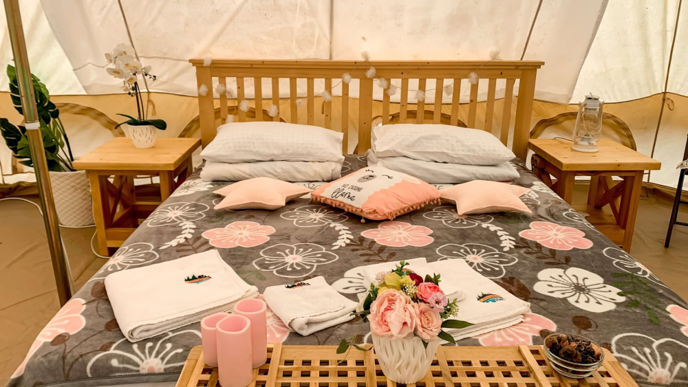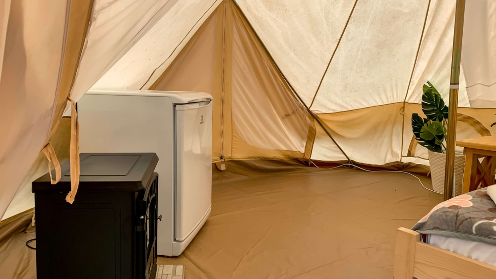 Каждый шатер рассчитан для двоих и находится на удалении от других домов, чтобы ничто и никто не мешали вашему уединенному отдыху. Внутри шатра установлена большая удобная двуспальная кровать с подогревом. Рядом с кроватью расположился открытый камин, у которого так приятно посидеть вдвоем прохладными вечерами. Для того чтобы в любую погоду вы чувствовали себя тепло и комфортно, все шатры имеют отопление. Также внутри каждого шатра установлен холодильник, есть микроволновка и вся необходимая посуда для приготовления вкусных обедов и ужинов. Для вашего комфорта каждый шатер мы оборудовали необходимыми удобствами: бойлером с горячей водой, унитазом и душевой.