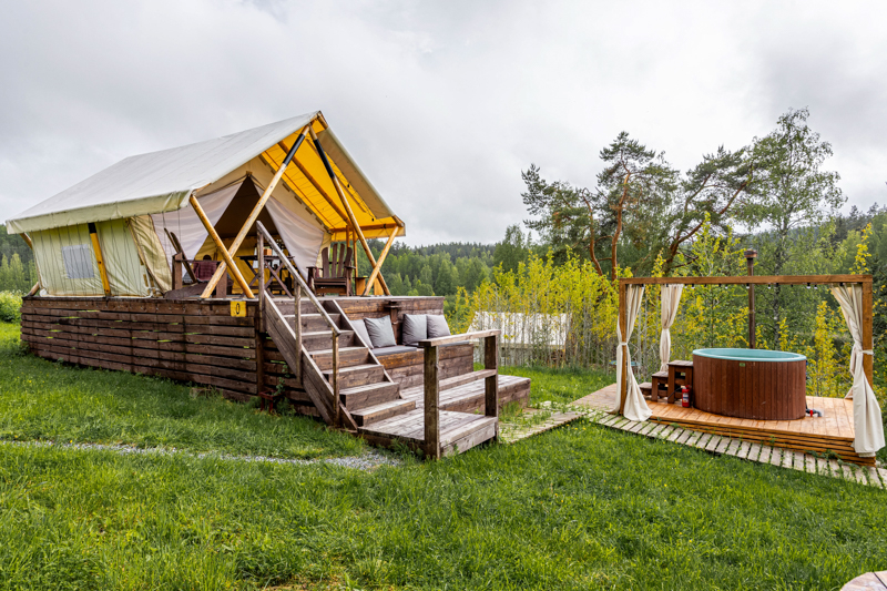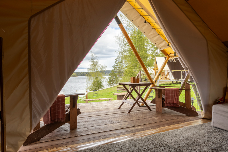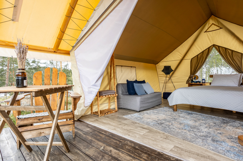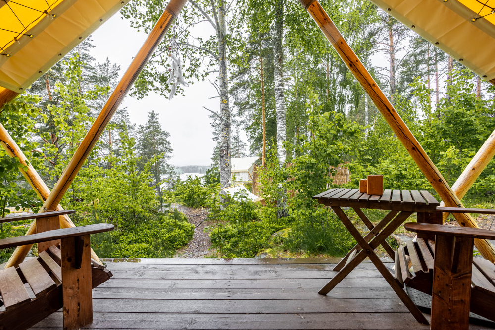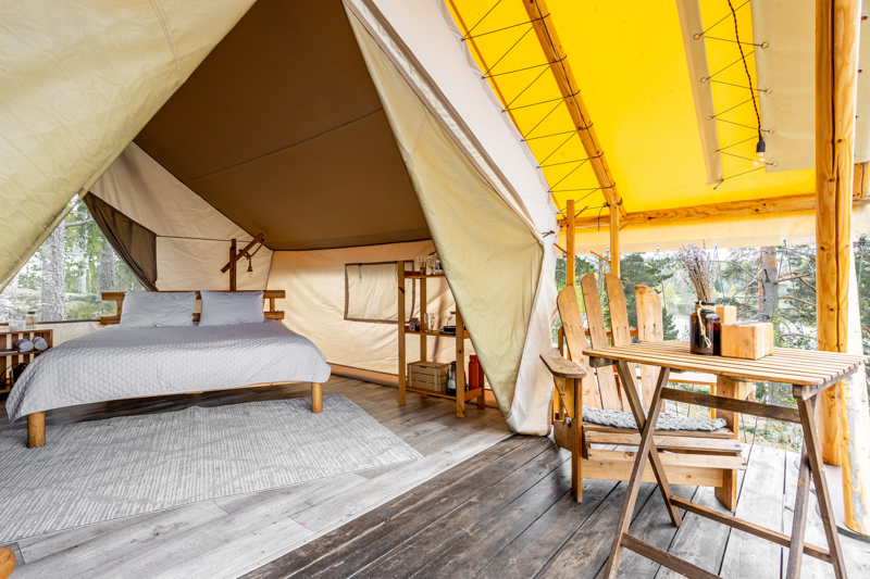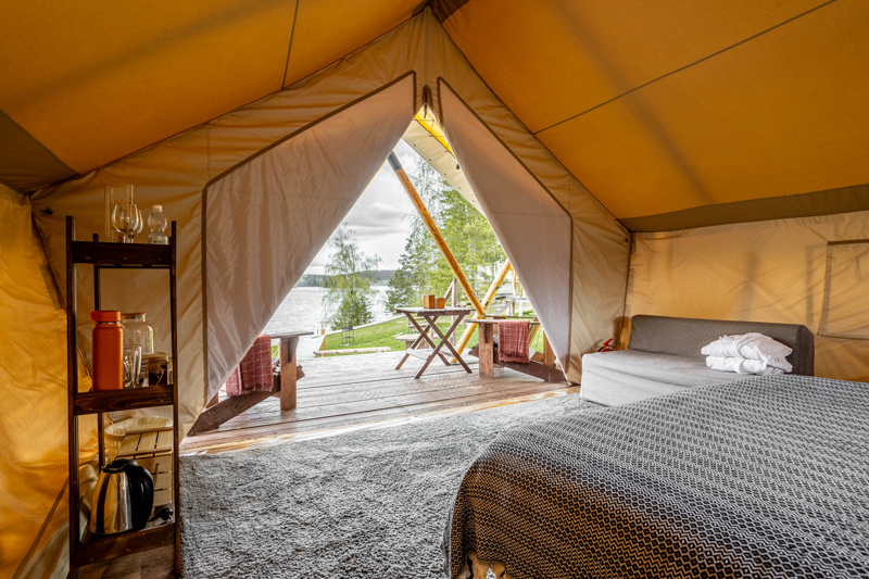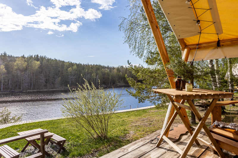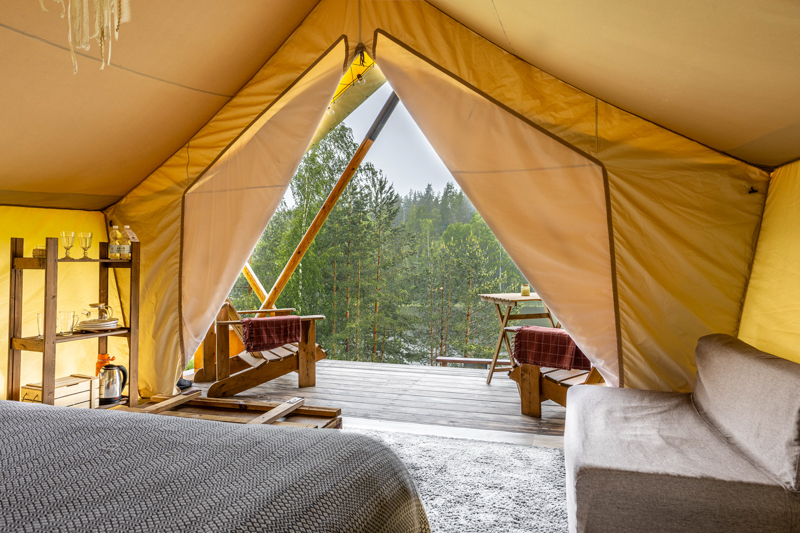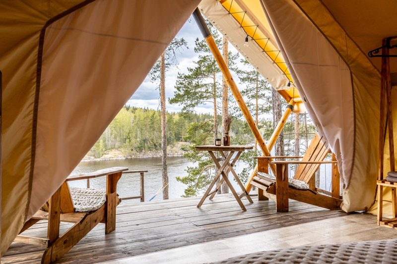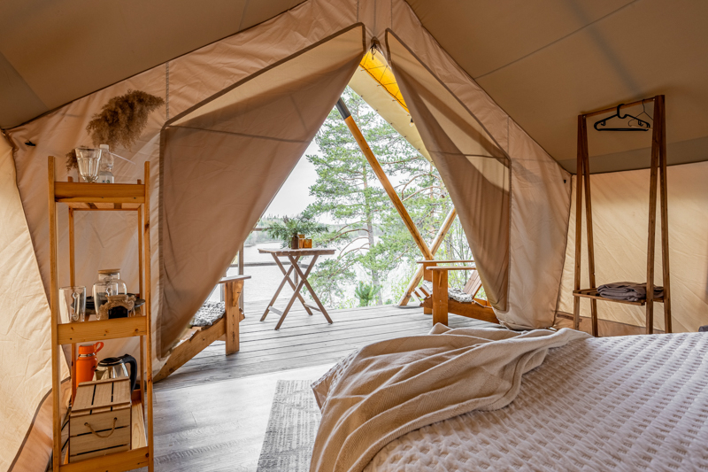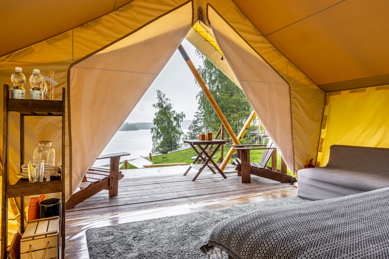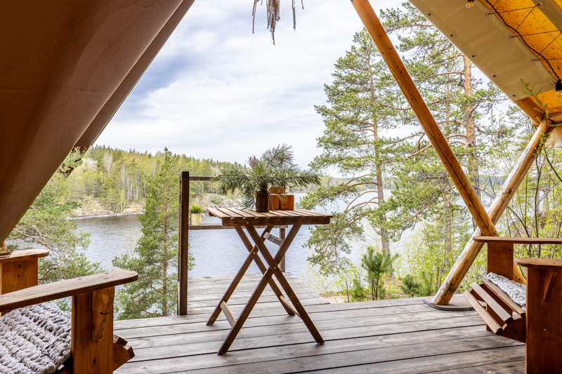 Стандарт без купели: уютные шатры с необходимыми удобствами для отдыха на природе с видом на Ладожское озеро.