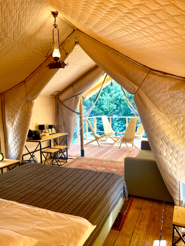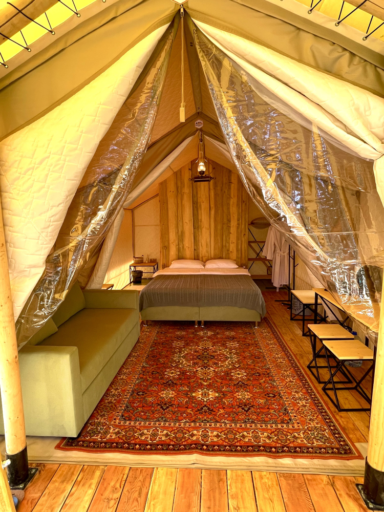 8 комфортных палаток площадью 24 м², каждая с индивидуальной террасой в 20 м².