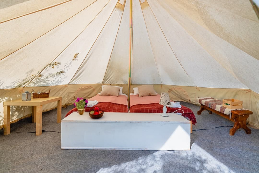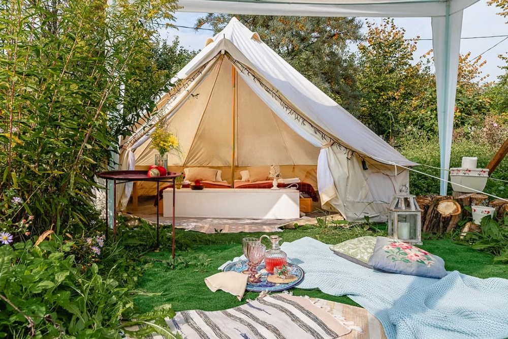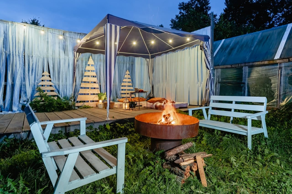 Вас ждут три уютных мини домика и два просторных шатра со всеми удобствами.