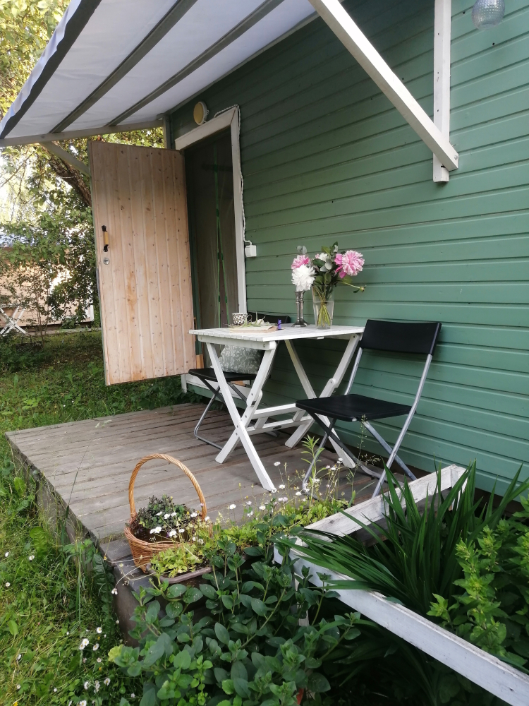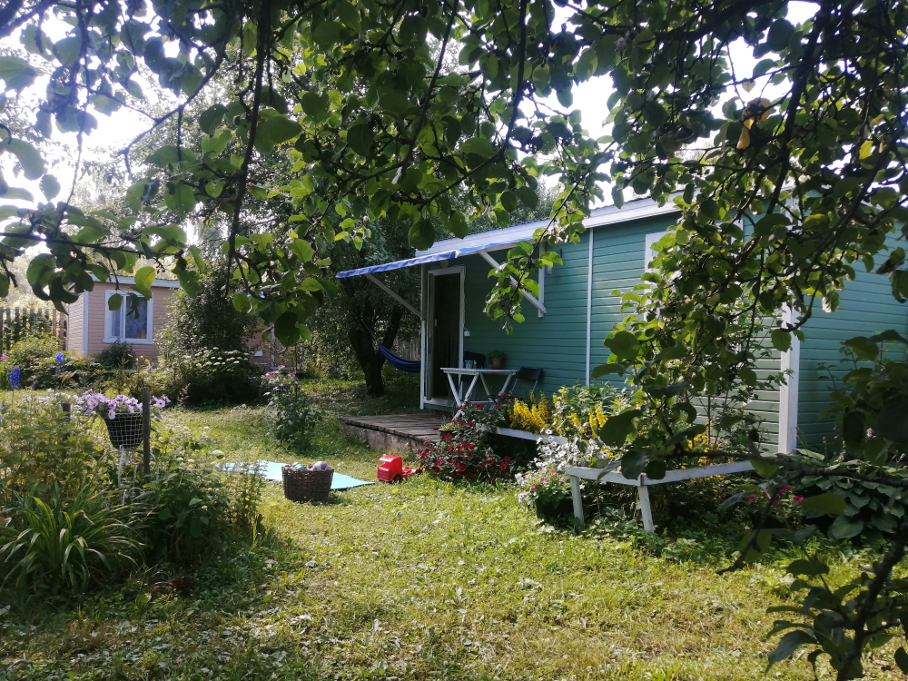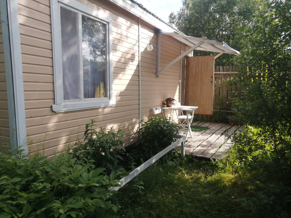 В летнем домике с деревянной верандой есть доступная кухня со всем необходимым оборудованием.