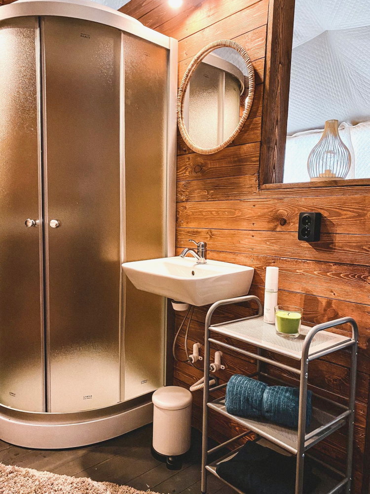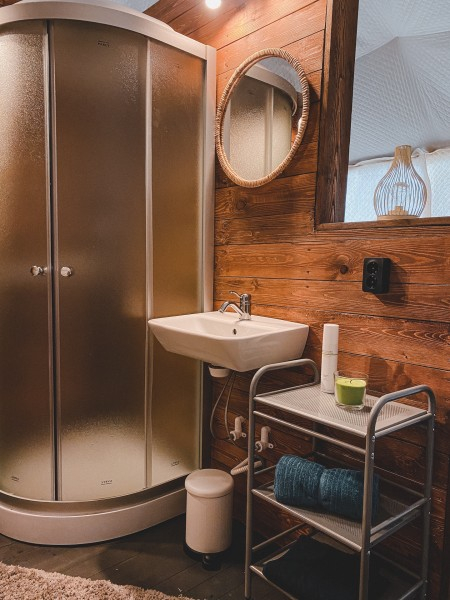 Санузлы: открытый санузел в геокуполах; общий санузел рядом с шатрами.