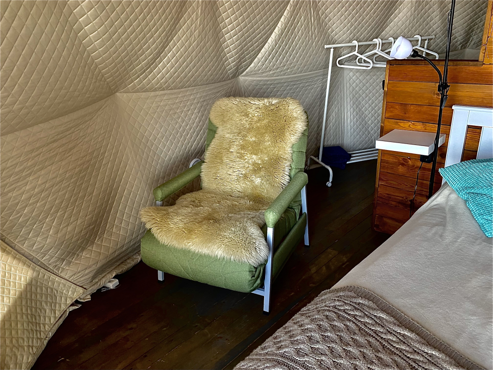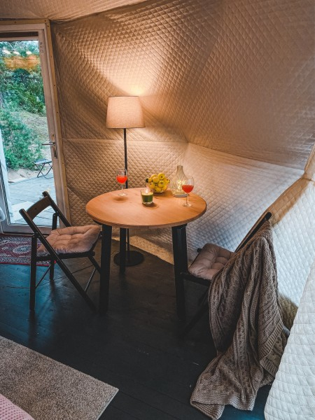 У каждого шатра стол со стульями. Решетки и шампура выдаются администратором.