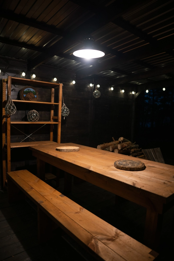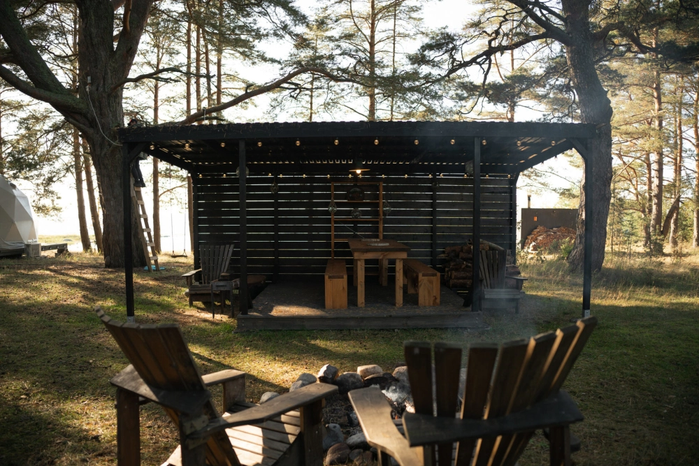 Костровые зоны, беседка и BBQ под крышей создают отличные условия для отдыха на природе: беседка защищена от ветра и дождя, оснащена мангалами, что позволяет готовить BBQ в любую погоду, рядом расположена первая костровая зона с удобными стульями "адирондак" и всегда доступными дровами, а большая компания может разместиться за просторным столом под крышей; вторая костровая зона находится недалеко от ресепшна, что добавляет удобства и комфорта.