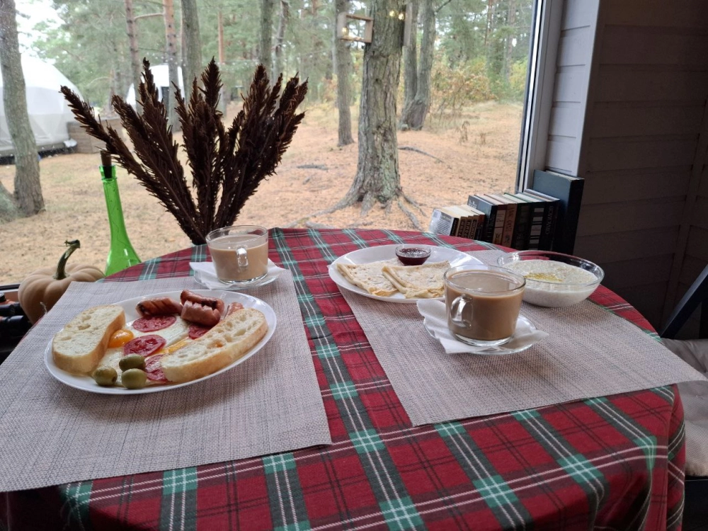 Наш ресепшн-бар работает круглосуточно, встречая гостей в уютной атмосфере, где можно позавтракать на терассе или в баре, заказав онлайн при бронировании или у администратора; здесь же вы найдёте горячий глинтвейн, напитки, угли, розжиг для мангала и вкусные блины с разнообразными начинками, а меню ресторана "Веранда", расположенного в 4 км, доступно в геокуполе с возможностью доставки за 500 рублей.
