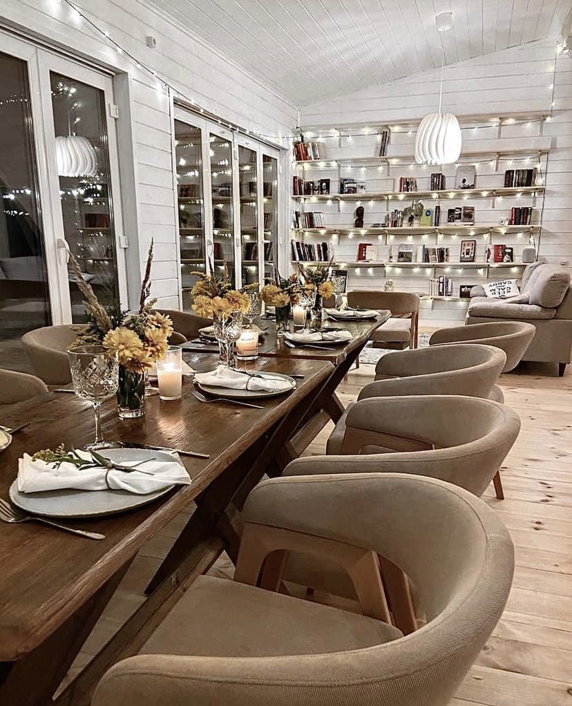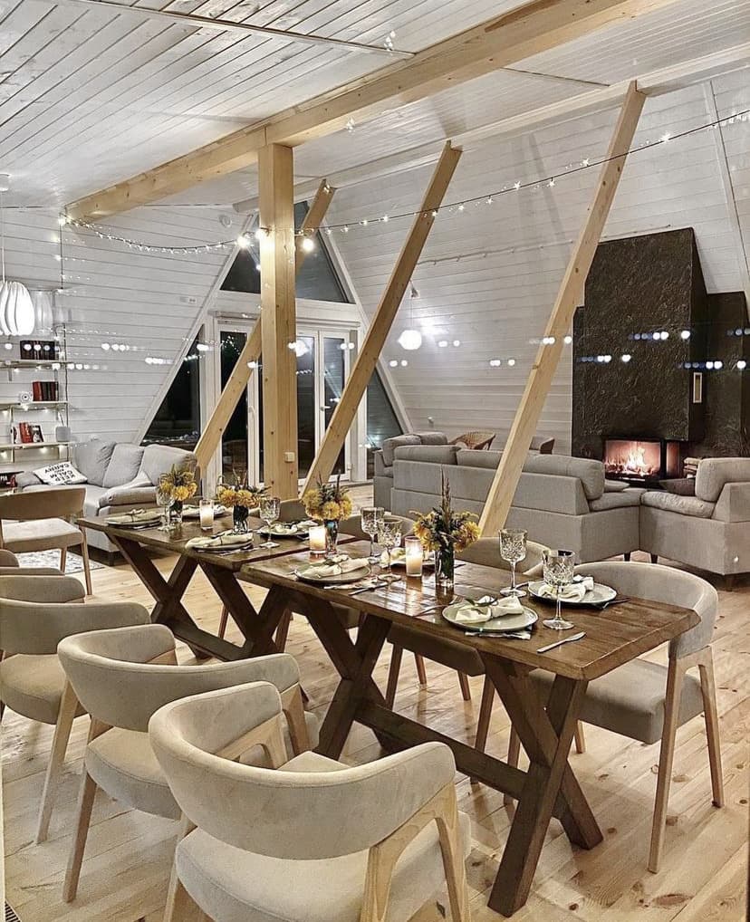 Представьте, что вы приехали в гости к друзьям и вас встречает гостиная с панорамными окнами, 2 удобнейшими диванами, журнальным столиком и свечами от бренда, обеденная зона - стол выполнен вручную старательными мастерами, а элегантные кресла-стулья сделаны на заказ. Печь-камин - будет создавать уют и согревать вас осенними вечерами, проектор - со всеми новинками кино, который адаптируется к любой поверхности, можно смотреть кино и внутри, и снаружи.