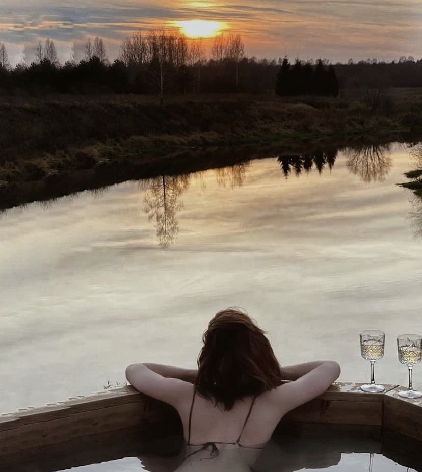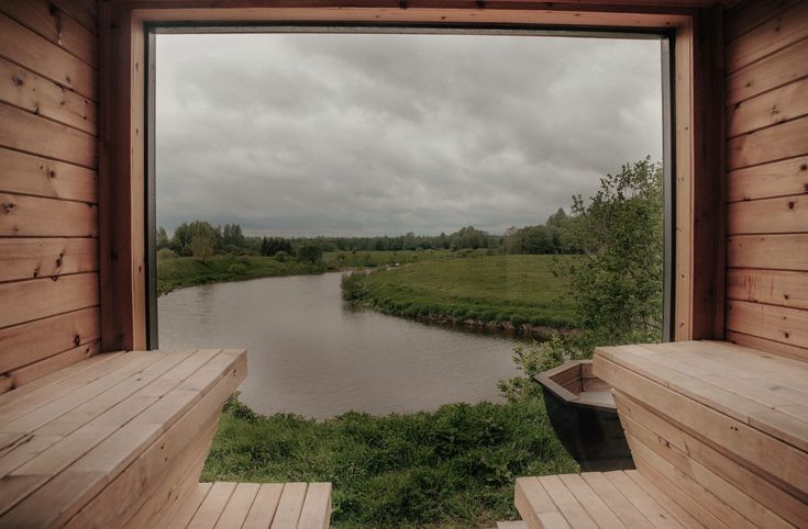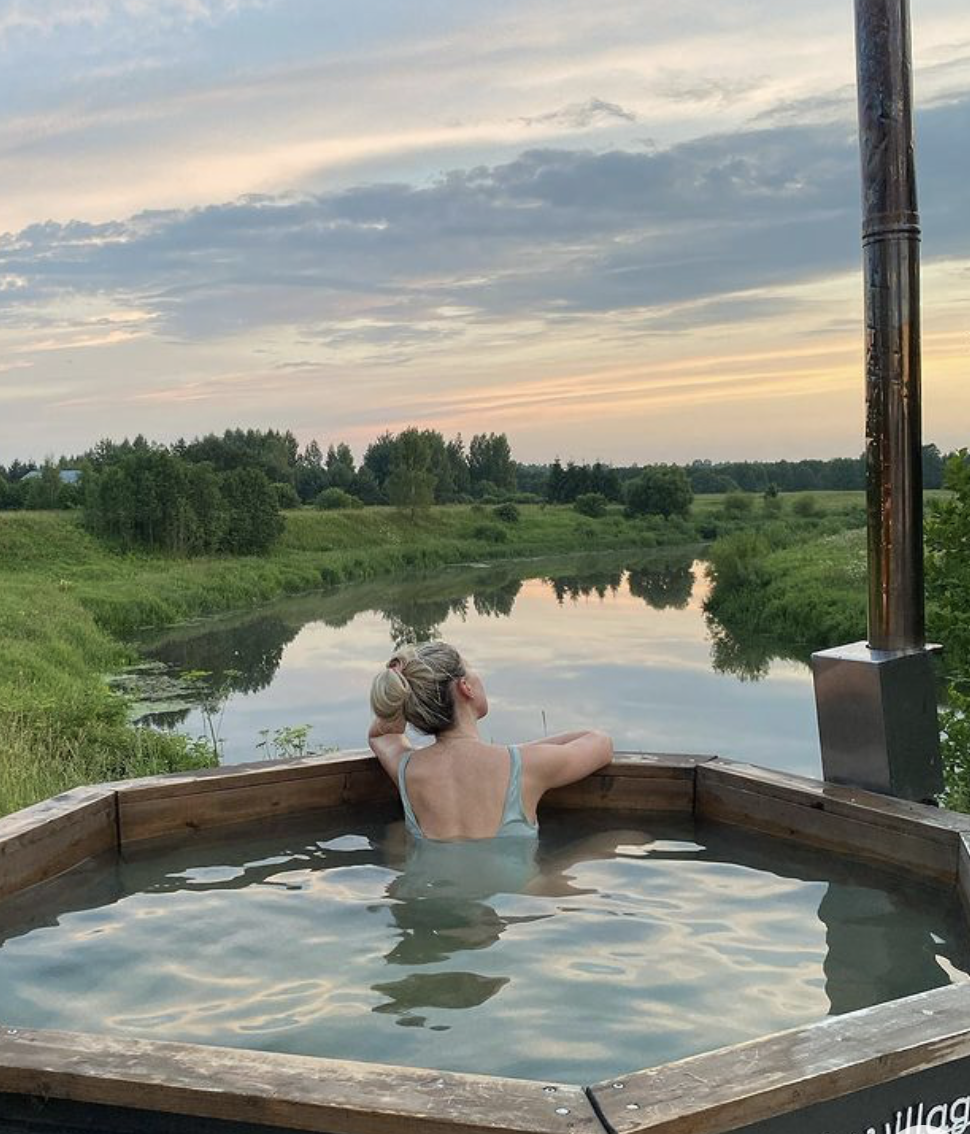 Баня с панорамным окном, откуда открывается великолепный вид на реку, особенно впечатляет на закате и вмещает до 6 человек; рядом расположена купель, которая может быть горячей или холодной по вашему желанию, чтобы наслаждаться окружающими пейзажами; в зоне отдыха предусмотрены стол, стулья, посуда, чай, душ с фирменной косметикой и банные принадлежности, а на крыше веранда с панорамным видом на реку и территорию, идеально подходящая для фотосессий, медитации, йоги, ужинов или просто отдыха на природе. Стоимость составляет 12 000 руб. за 2 часа.